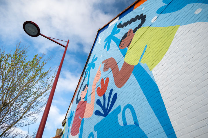 “Titik Temu,” which means meeting point, is a mural about connection, recognition, and the evolving presence of women in street art. Two women, perhaps reflections of one another, perhaps strangers, gently reach out to meet at the fingertips. It’s a quiet, powerful gesture that speaks to solidarity, growth, and the change that happens when women are seen, supported, and celebrated.