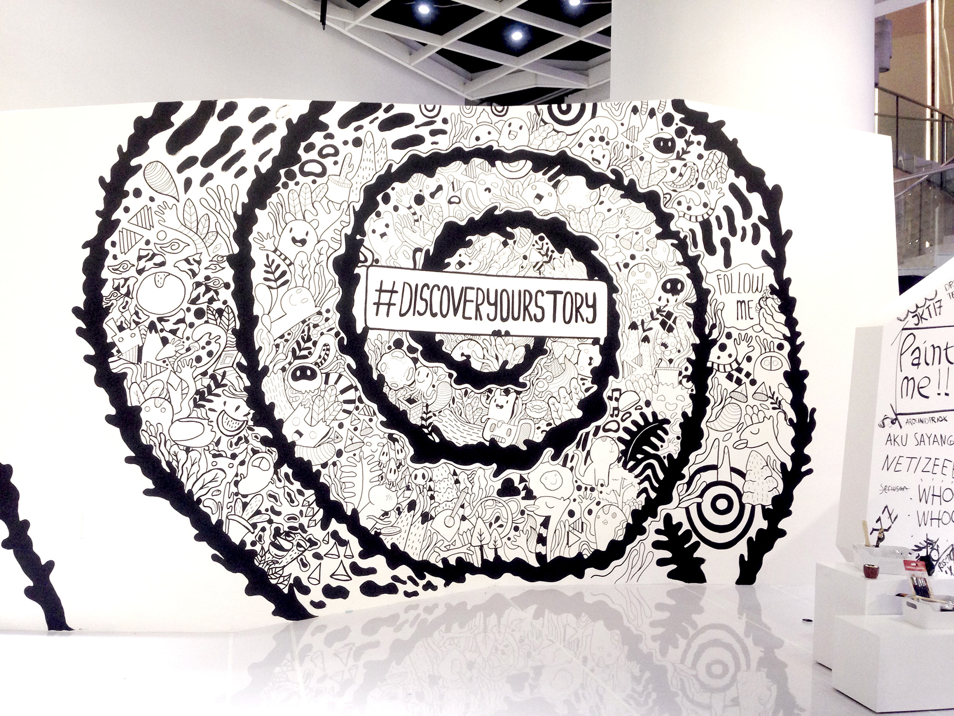 Acara ini menjadi memori yang tak akan pernah saya lupakan. Saya berkesempatan membuat sebuah mural bertema doodle untuk perusahaan ternama di dunia. Instagram: Discover Your Story. Mural ini saya kerjakan secara live selama acara berlangsung. Proses pengerjaannya menggunakan cat dan memakan waktu sekitar satu hari. Luas bidang mural ini 5m x 3m. Acara ini di adakan di Ciptra Artpreneur Jakarta.