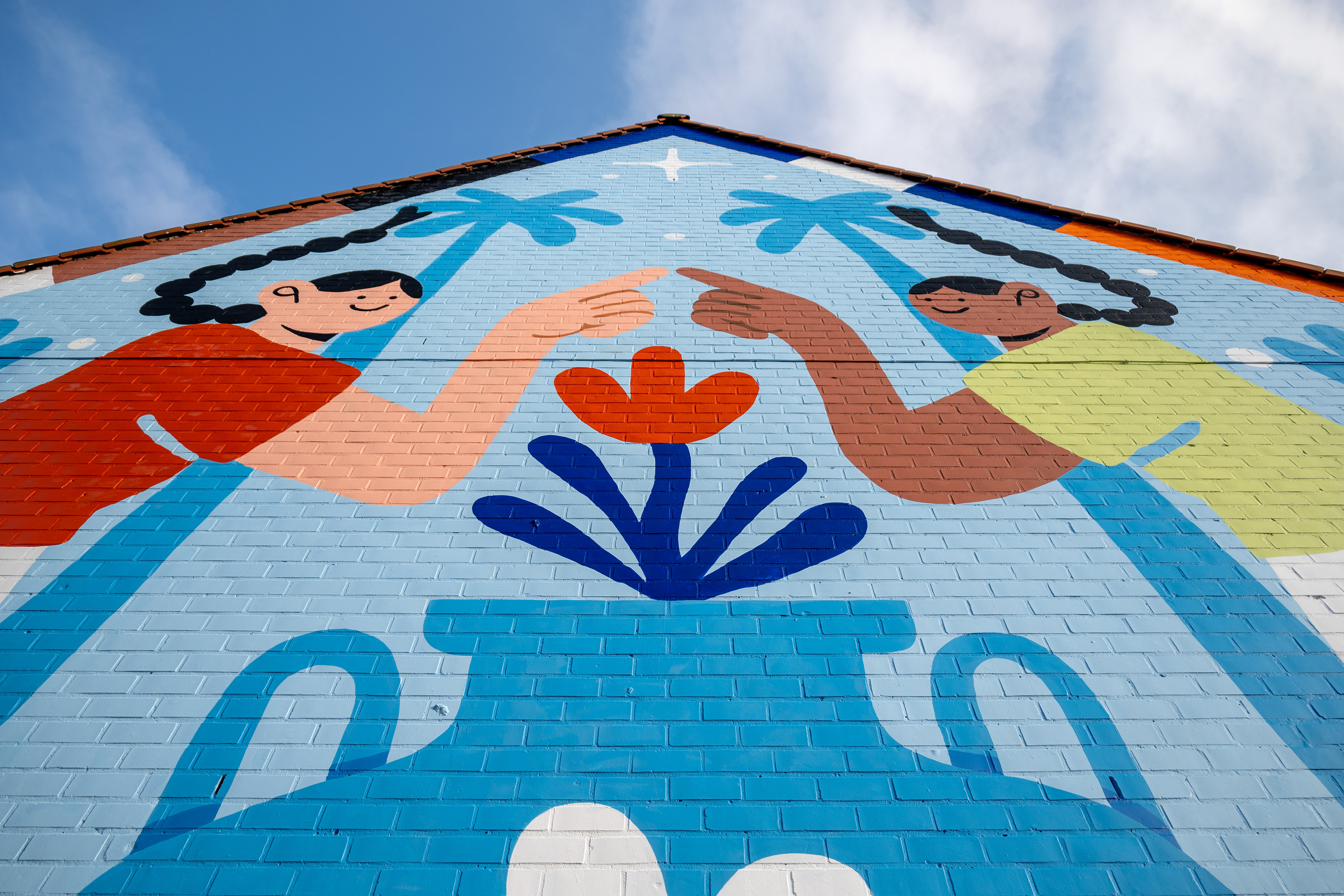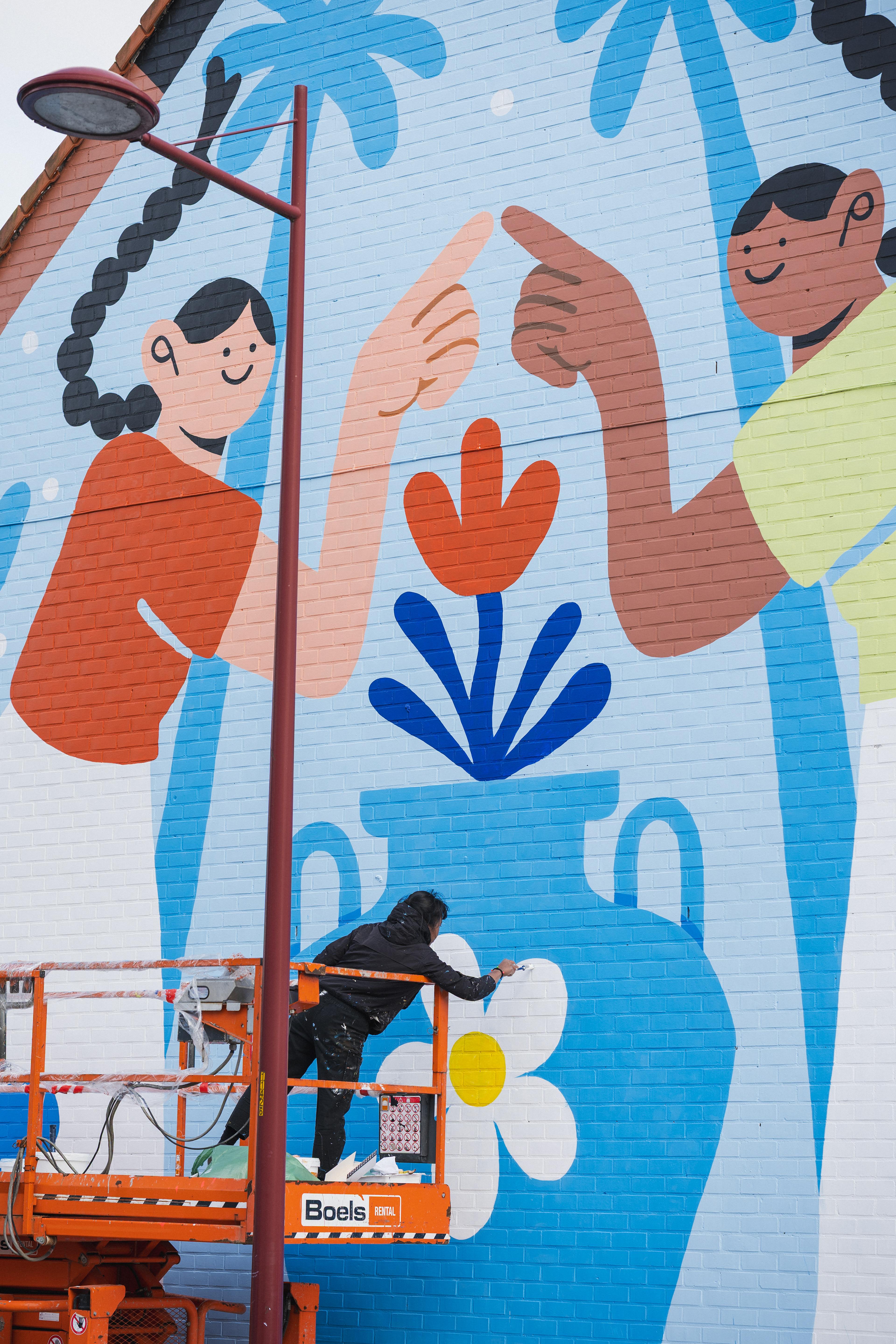 “Titik Temu,” which means meeting point, is a mural about connection, recognition, and the evolving presence of women in street art. Two women, perhaps reflections of one another, perhaps strangers, gently reach out to meet at the fingertips. It’s a quiet, powerful gesture that speaks to solidarity, growth, and the change that happens when women are seen, supported, and celebrated.